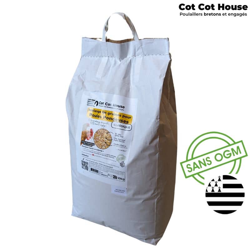 Cet aliment est un mélange de céréales sans additif (vitamines, protéines, etc.), sans OGM, 100% naturel. Pour avoir de bons oeufs sans OGM ! Cultivées en Bretagne, nos céréales sont produites par le paysan sur son exploitation. Elles sont ensuite ensachées avec ❤️ par des talents en situation de handicap à côté de Rennes.