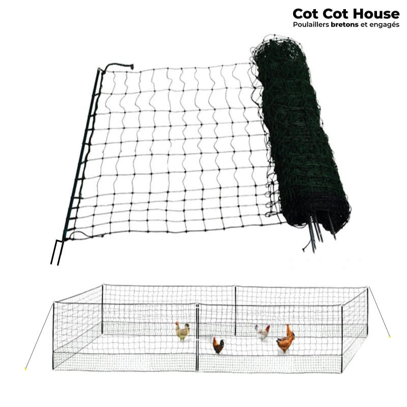 Vos poules manquent d'espace ou vous souhaitez leur réserver une zone du jardin et protéger vos salades ? Cot Cot House vous propose une solution pratique : la clôture filet pour poules ! De plus, vous pourrez concentrer le travail des poules au pied des pommiers pour les laisser dévorer les larves et autres parasites qui se logent dans le sol avant de monter infecter vos pommes !
