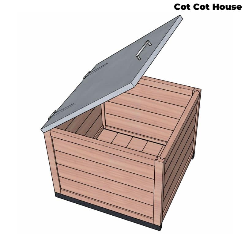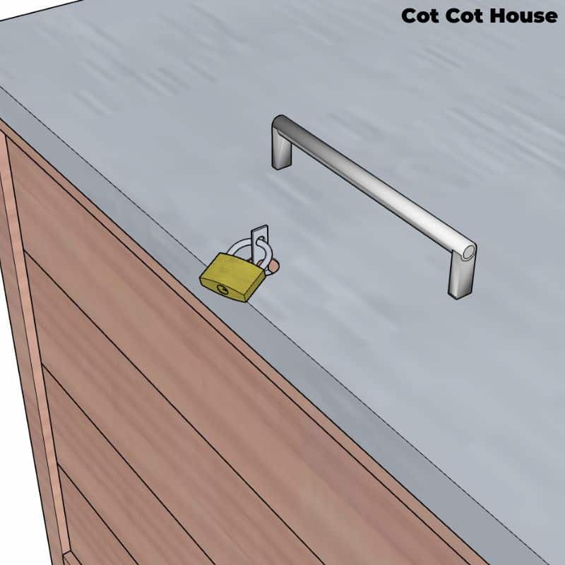 Coffre très résistant de rangement en Douglas couvert d’un toit galvanisé pour le stockage de la litière et des graines au pied du poulailler. Le coffre peut être fermé à clé avec un cadenas. Idéal pour un entretien simple, avec tout à disposition, proche du poulailler.