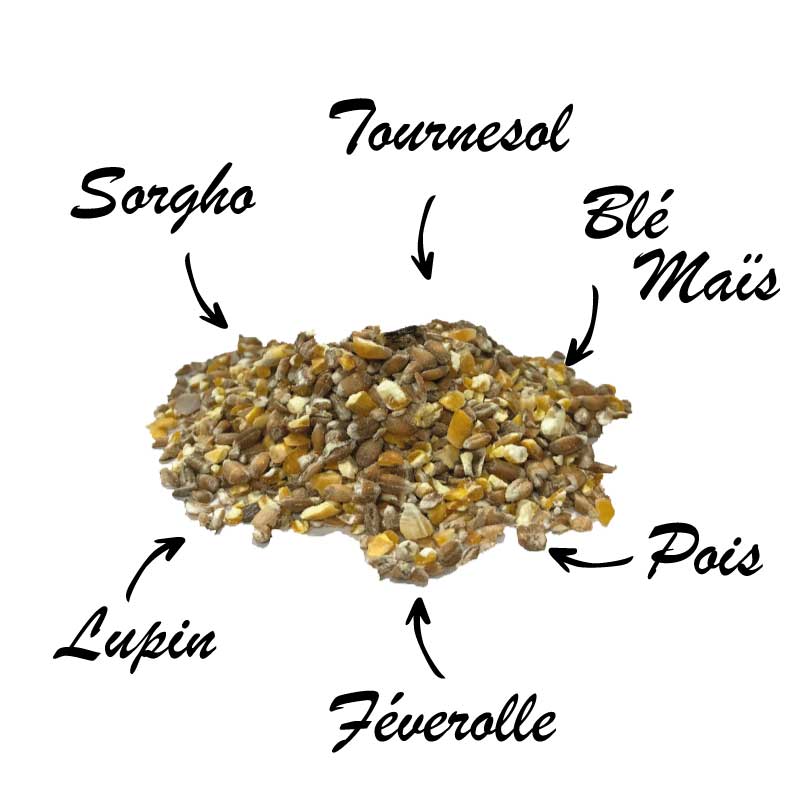 - Composition : Blé, maïs, sorgho, tournesol broyé et entier, féverole, lupin et pois.