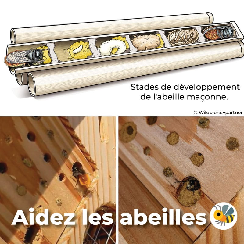 • Espace Percé : Osmies (abeilles solitaires qui pollinisent 10x plus qu'une abeille domestique).