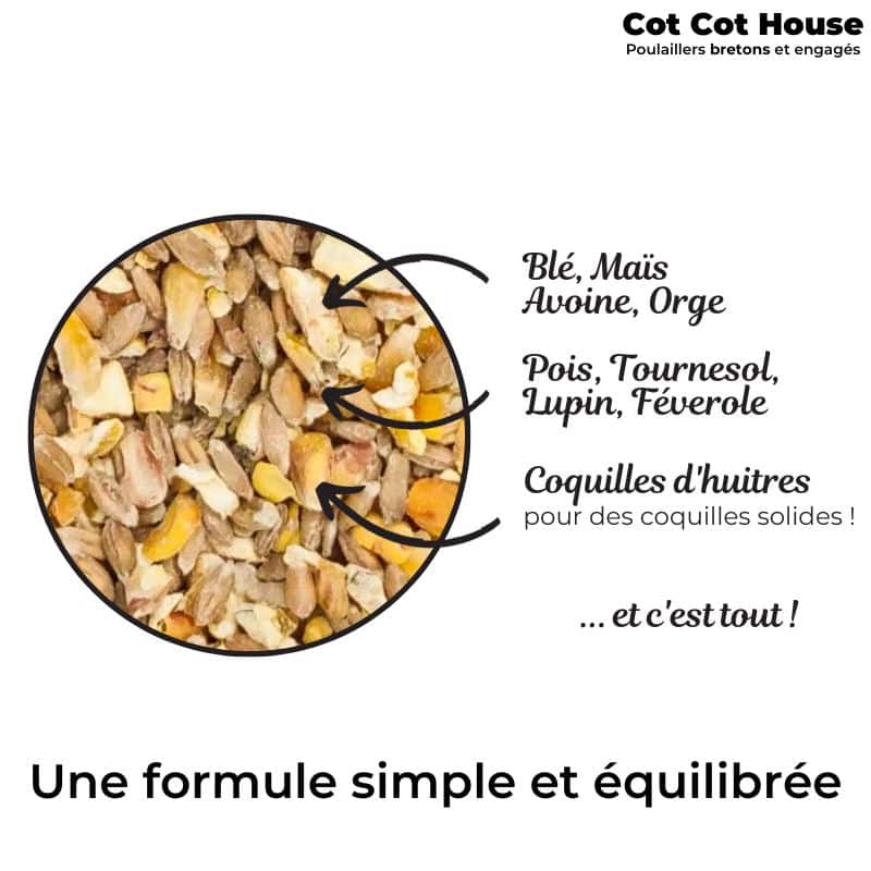 Cet aliment est un mélange de céréales sans additif (vitamines, protéines, etc.), sans OGM, 100% naturel. Pour avoir de bons œufs sans OGM ! Cultivées en Bretagne, nos céréales sont produites par le paysan sur son exploitation. Elles sont ensuite ensachées avec ❤️ par des talents en situation de handicap à côté de Rennes.
