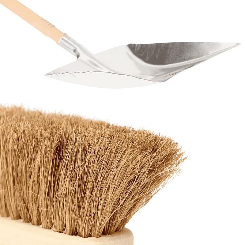 Kit de nettoyage du poulailler : une pelle en métal et une balayette en fibre de coco fabriquées en France.