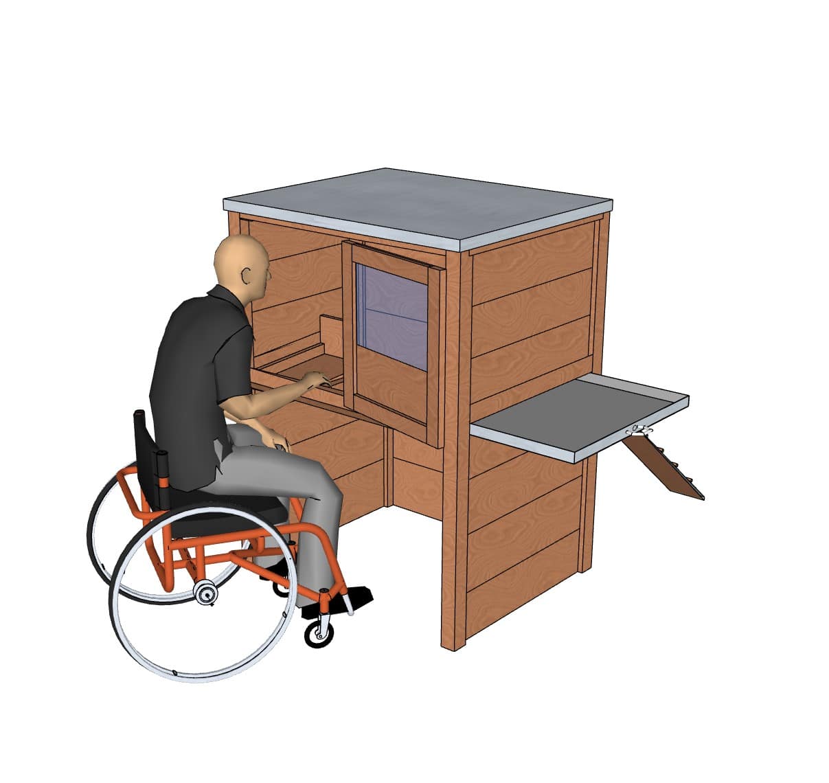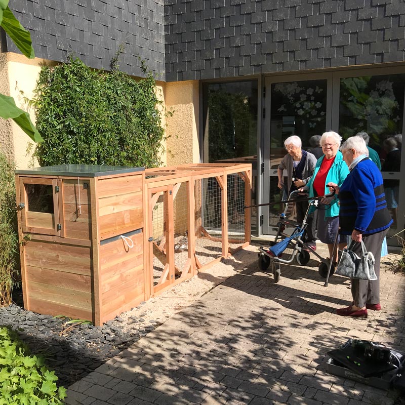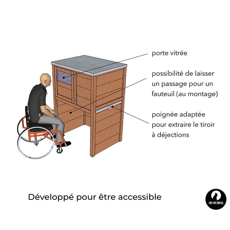 Dessiné en collaboration avec l'ergothérapeute d'un Foyer pour personnes en situation de handicap moteur, ce poulailler est fait pour un usage simple et adapté aux fauteuils roulants. Sa hauteur le rend également plus confortable dans l'usage qu'un poulailler Houdan standard.